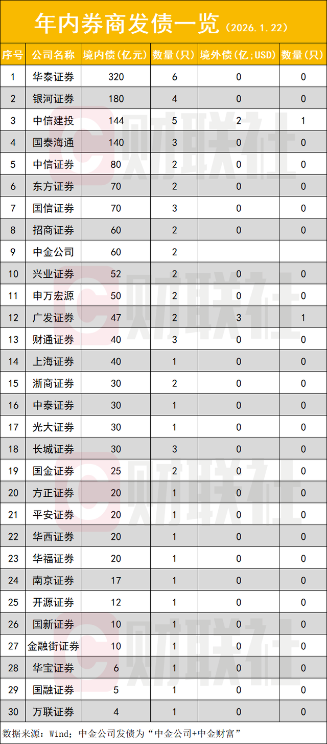 Wind统计显示,华泰证券以320亿元的年内发债规模登顶,成为开年发债最活跃的券商;银河证券、中信建投、国泰海通分别以180亿元、144亿元、140亿元的规模紧随其后,构成发债第一梯队,上述4家券商发债规模合计达784亿元,占总发行规模的34.53%。